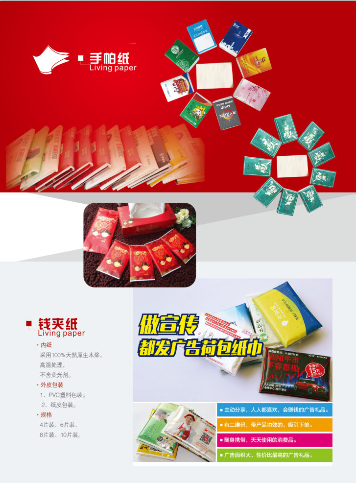 專設(shè)印制廣告紙巾,為服務(wù)行業(yè)配套用紙?zhí)峁┒喾轿坏倪x擇。